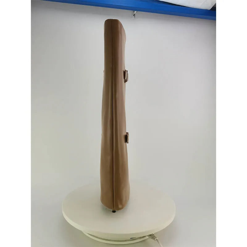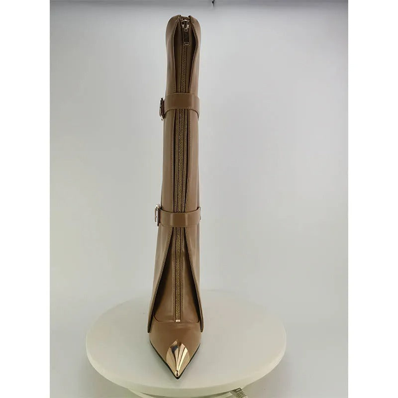 High-cut boot with a striking silhouette and three adjustable straps for a secure fit and clean lines. The pointed toe is finished with a gold-tone metal cap, adding a precise, luxurious touch. The smooth shaft sits comfortably on the leg, creating an upright, elegant shape. Ideal for confident appearances, evening looks, and modern streetwear combinations.
